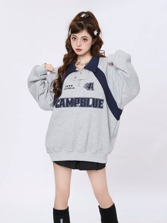 American Retro Block Color Polo Collar Loose Sweatshirt