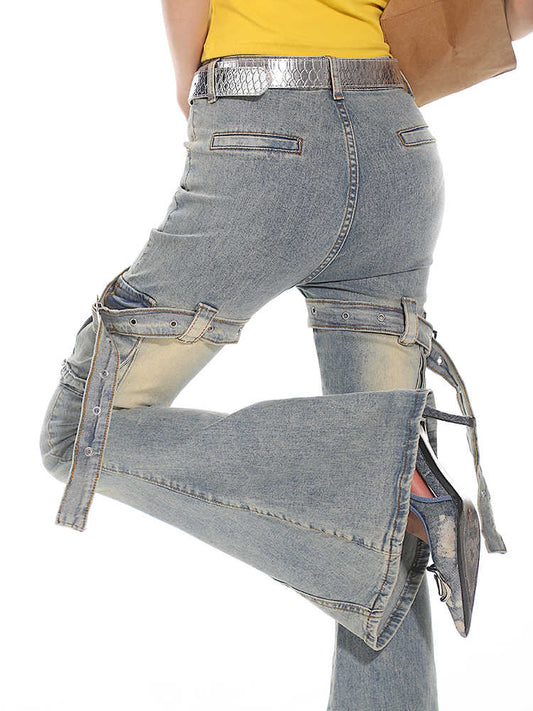 Y2K Distressed Belt Buckle Flared Jeans