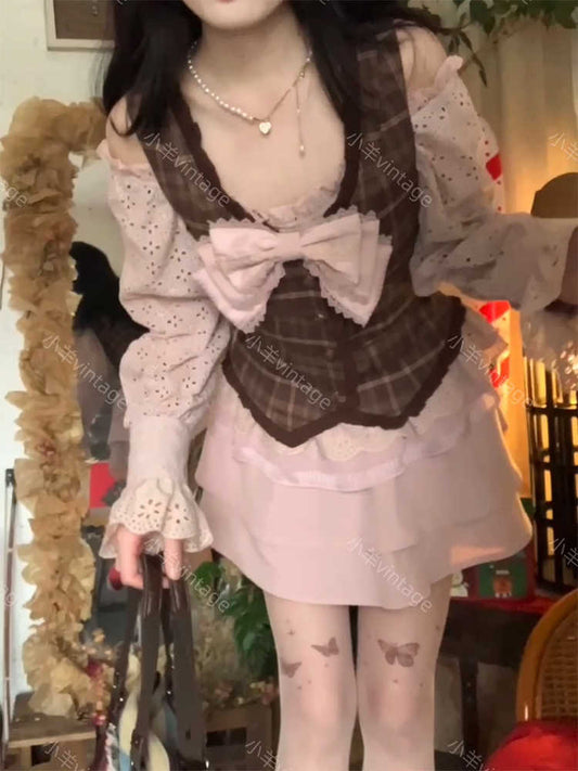Retro Bow Lace Top Pink Plaid Vest