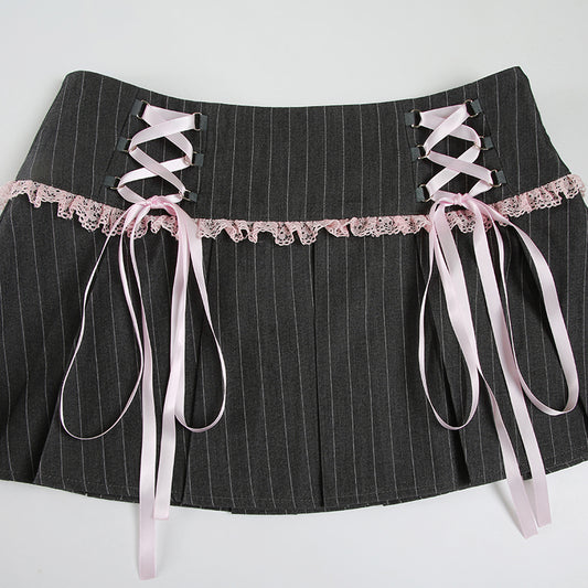 Bow Straps Striped Pleated Skirt
