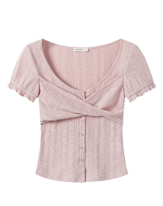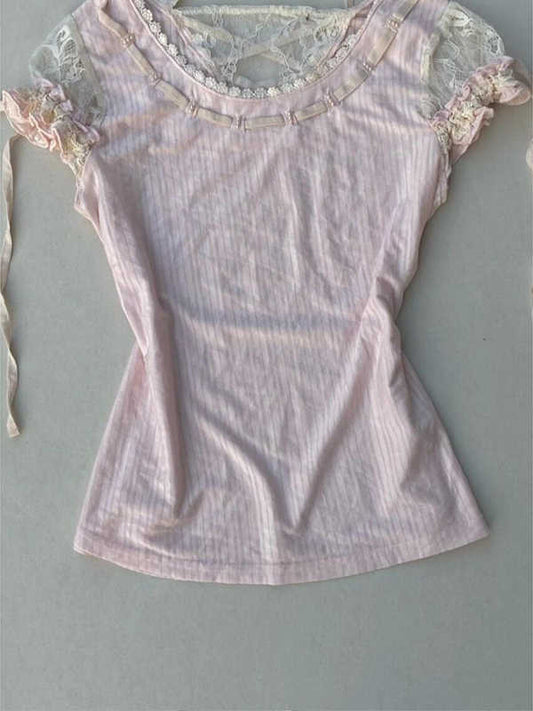 Pink Lace Splicing Short-sleeved Top