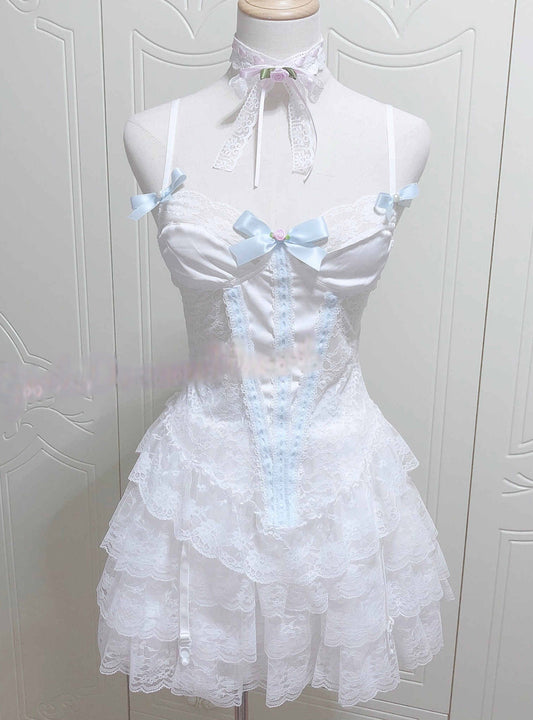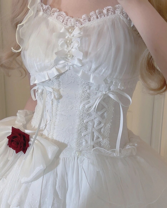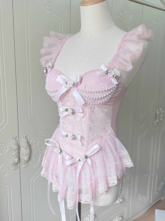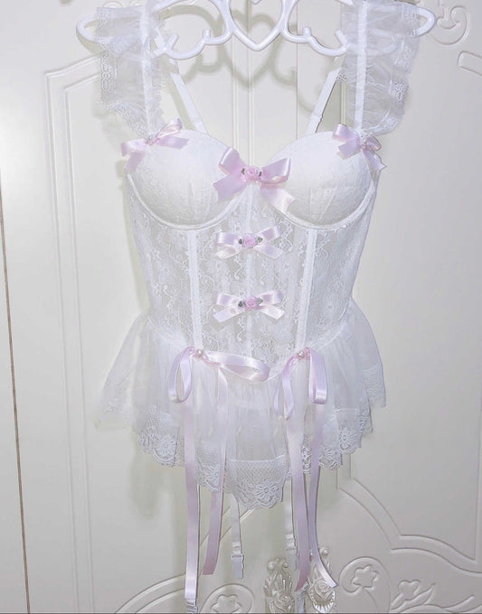 Vintage Lace Bow Herringbone Corset Bodysuit