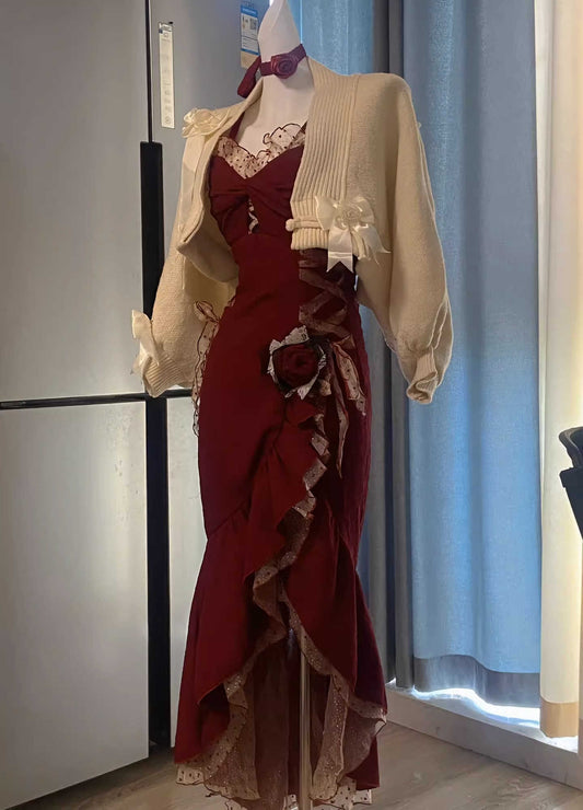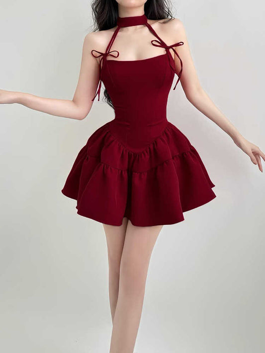 Burgundy Halter Neck Lace Dark Coquette Dress