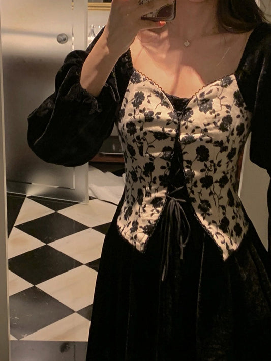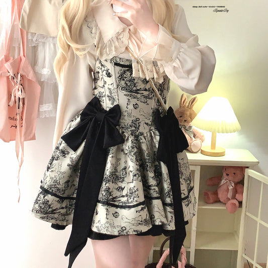 Jacquard Retro Fishbone Bow Dark Coquette Dress