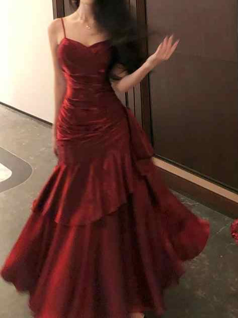 Burgundy Satin Fishtail Prom Dress