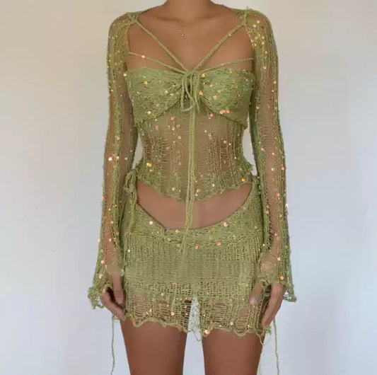 Baddie Sequined See-through Knitted Suit