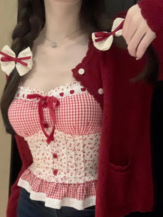 Floral Red Plaid Bow Tank Top