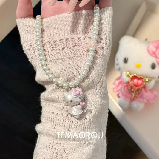 Bow KT Cat Pendant Pearl Necklace