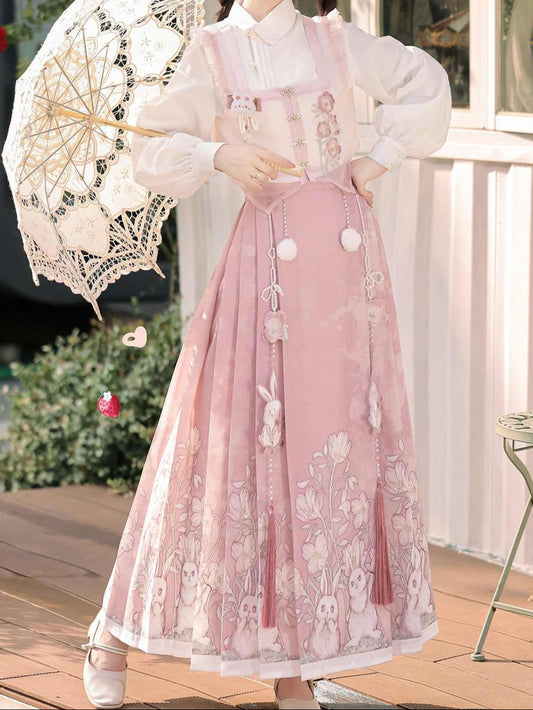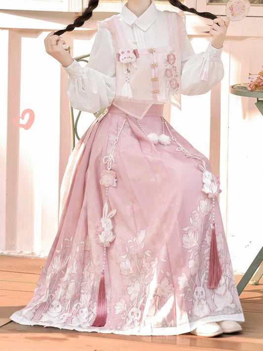 Hanfu Aesthetic Pink Rabblit Shirt + Skirt Suit