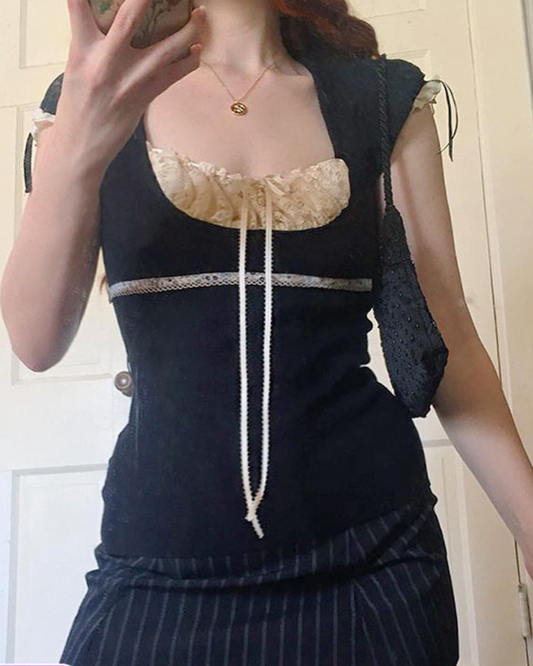 Polka-dot Neckline Lace Woolen Gray Coquette Top