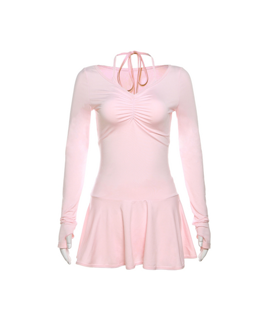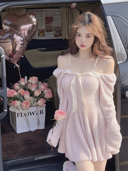 French Sweet Bow Knitted Long-sleeved Mini Coquette Dress