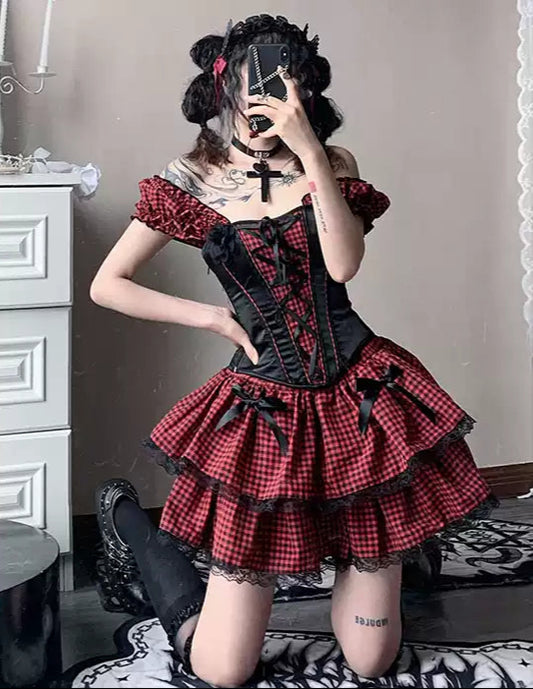 dark coquette lace splicing plaid cake multi-layer irregular long skirt
