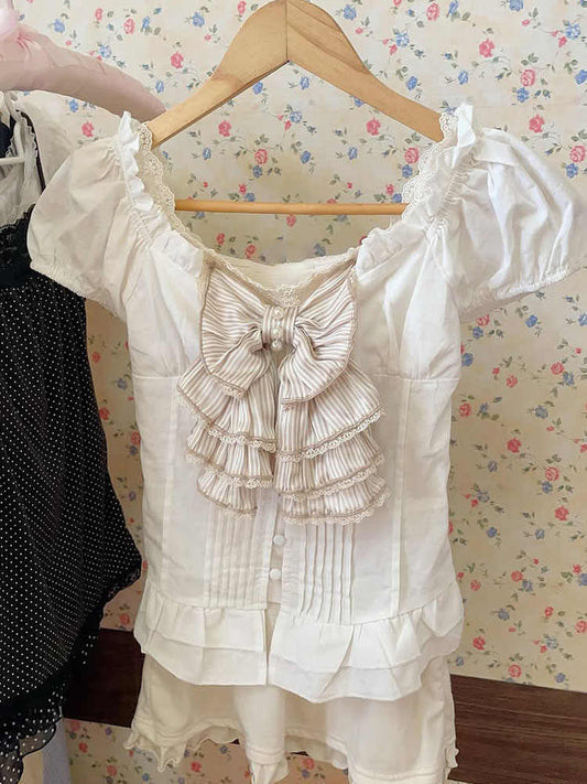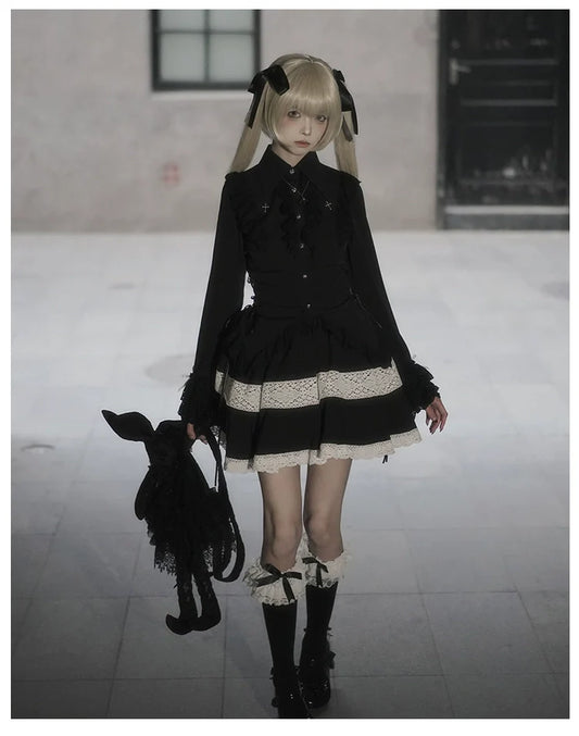 Gothic Lolita Blouse Black White Waist-Tie Shirt