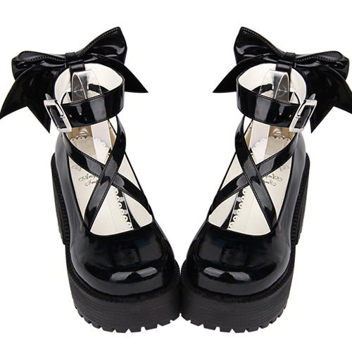 Black Patent Leather Cute Bowknot Lolita Round-toe High Heel Shoes
