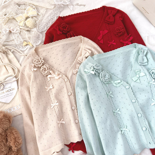Apricot knitted suspender + purple knitted cardigan + knitted patchwork cake skirt