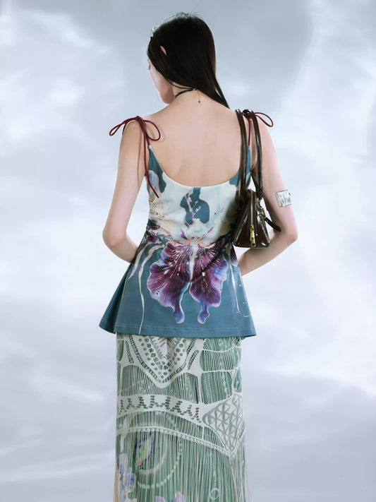 Floral Printed Knitted Vest Beaded Camisole Top