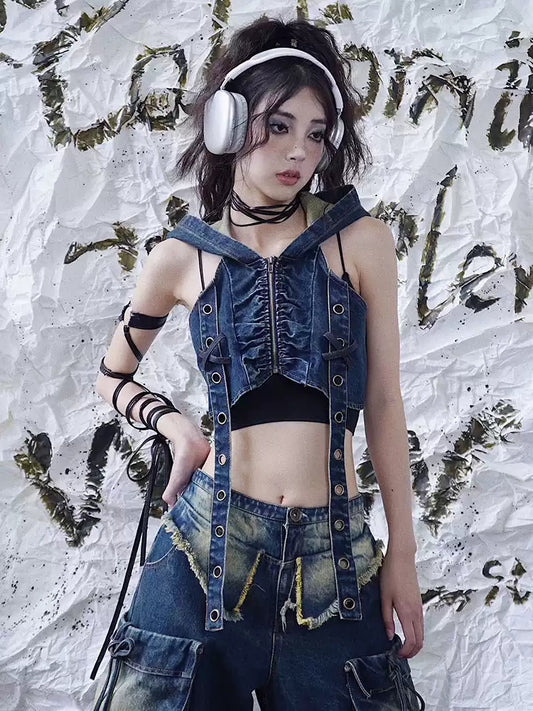 wasteland denim hooded punk rock vest