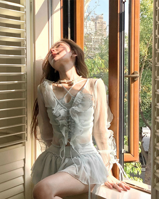 Clear Ruffle Mesh Top Long Sleeve
