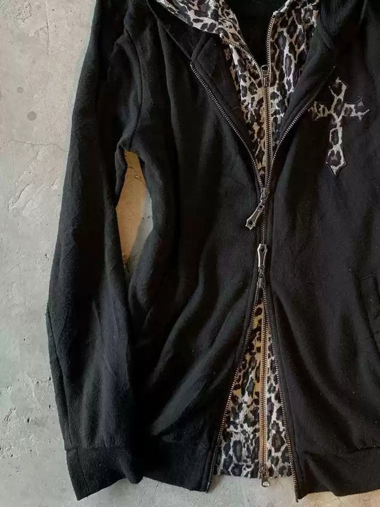 retro fake two-piece hooded leopard sweatshirt jacket