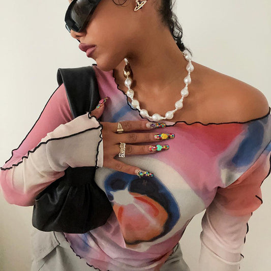 Long-sleeved Mesh Printed Top