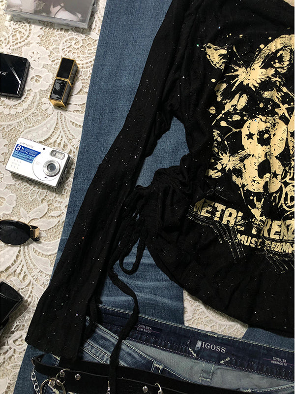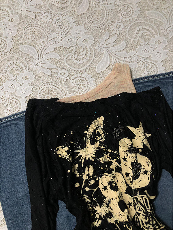 American retro butterfly graffiti off-shoulder long-sleeved top