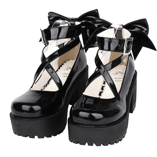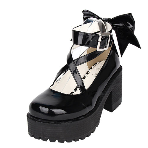 Black Patent Leather Cute Bowknot Lolita Round-toe High Heel Shoes