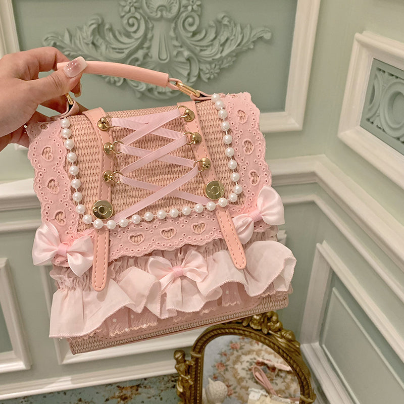 Bow Pearl Ribbon Straw Backpack