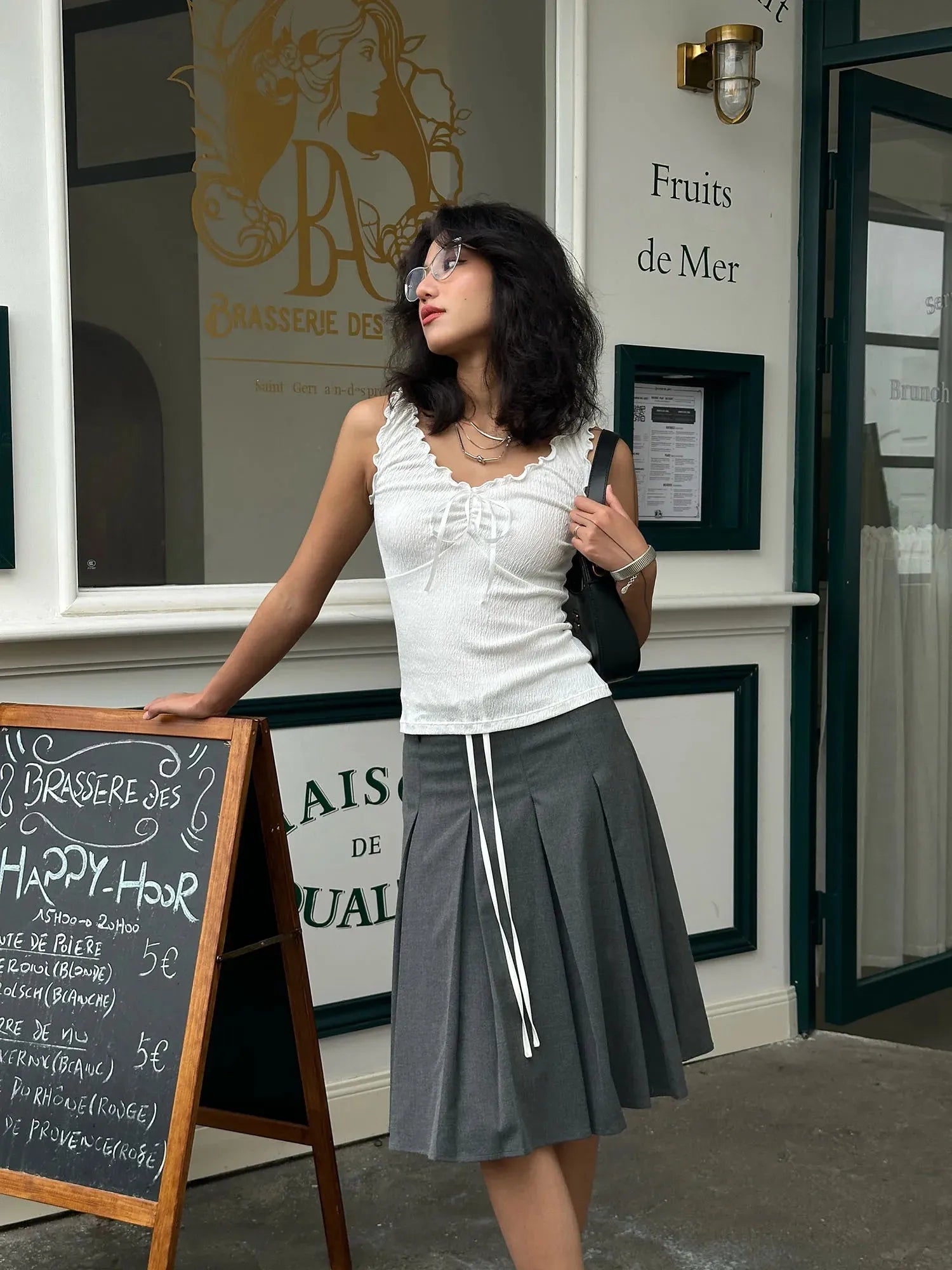 Ruffled edges and a tie-up front meet soft, stretch-kissed texture for a top that blends girly charm with casual flair. Fitted to flatter and easy to pair with low-rise skirts or wide-leg jeans, it’s a go-to look for café dates, gallery strolls, or snapping pics with a soft-grunge filter.