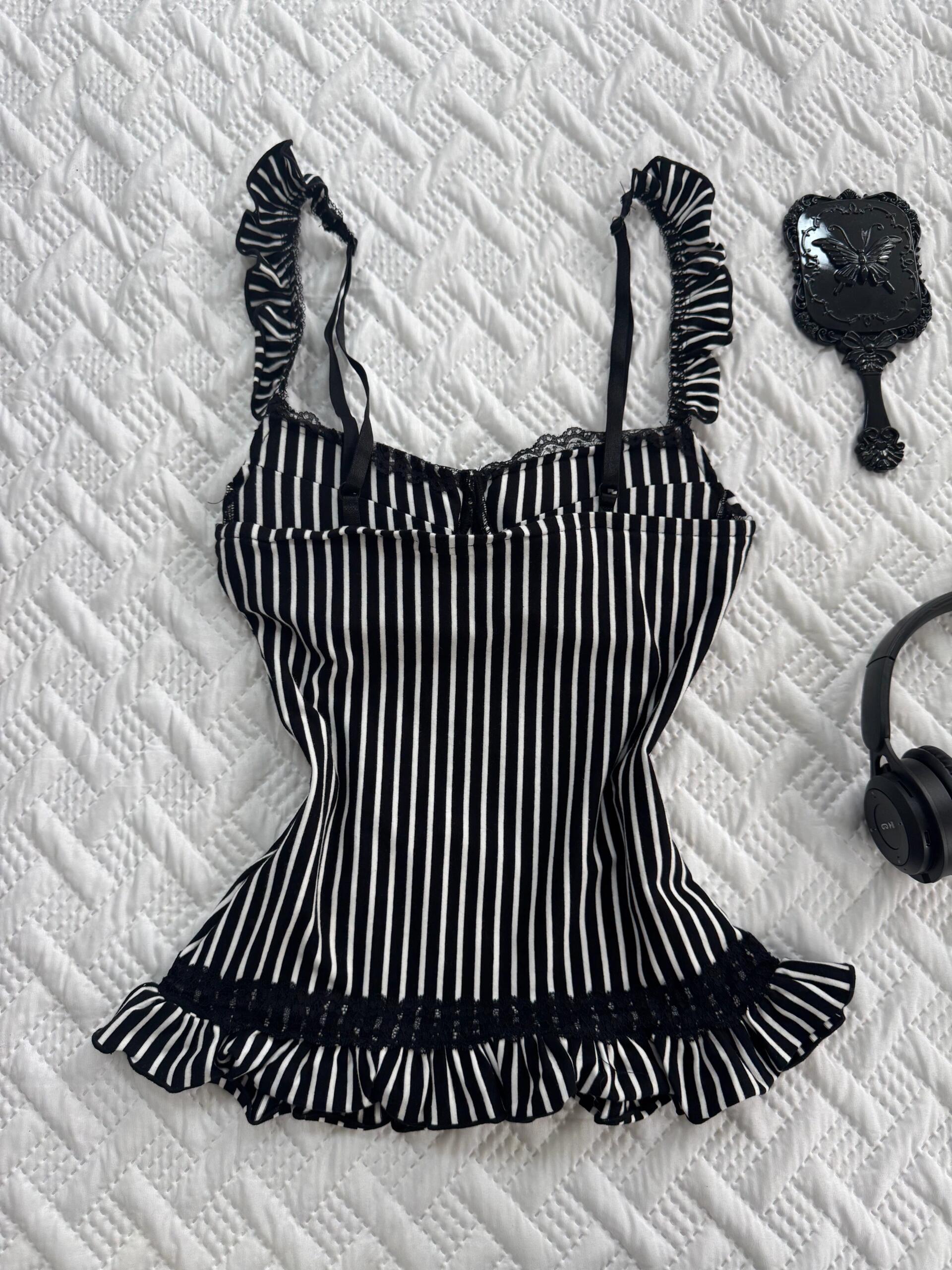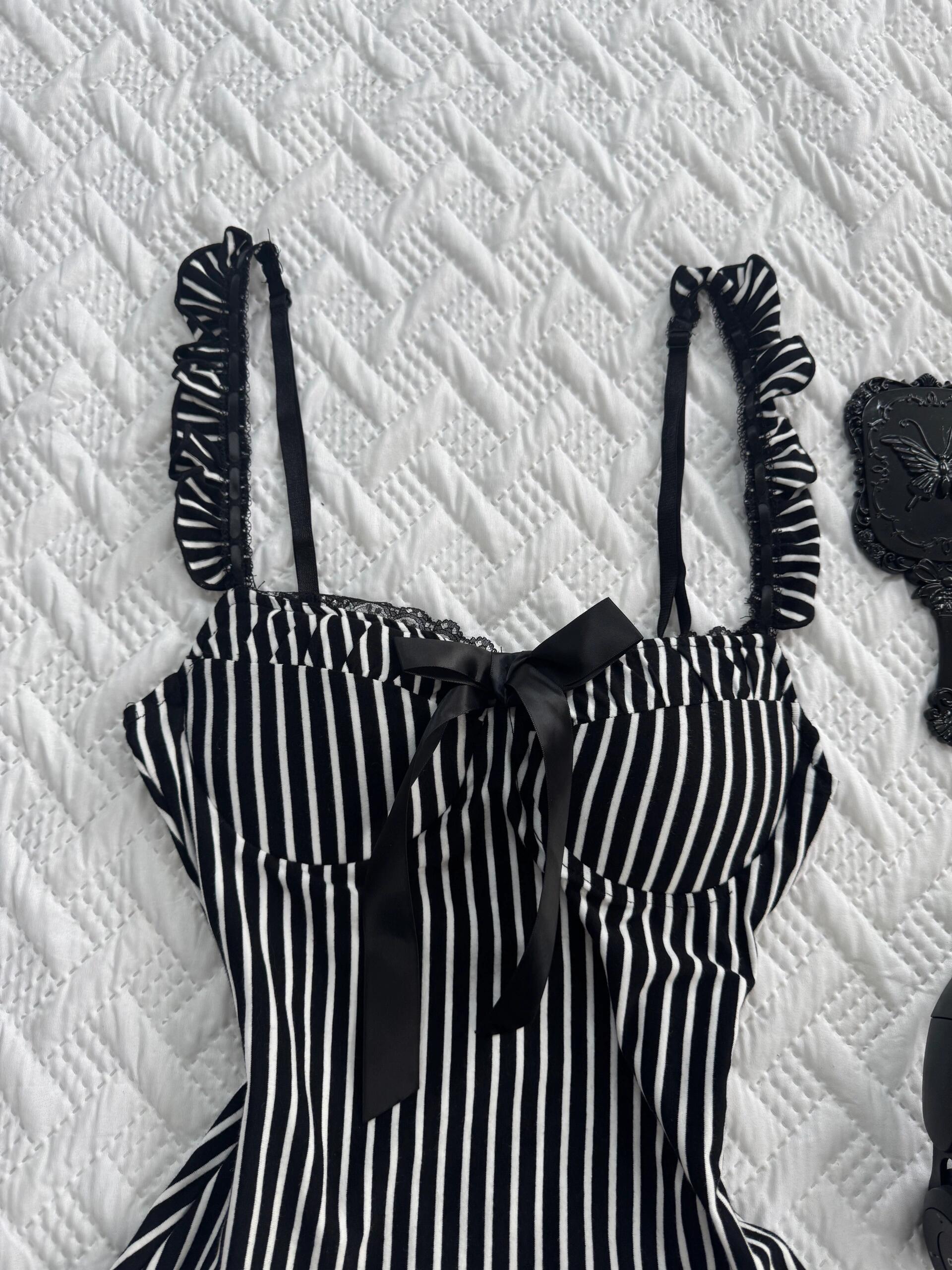 Elevate your style with the dark coquette Bow Lace Striped Tank Top, combining playful stripes with delicate lace and a charming bow detail. This tank top offers a flattering fit that enhances your silhouette while adding a touch of feminine elegance to your look. Perfect for layering or wearing alone, it effortlessly blends comfort and sophistication for any occasion.