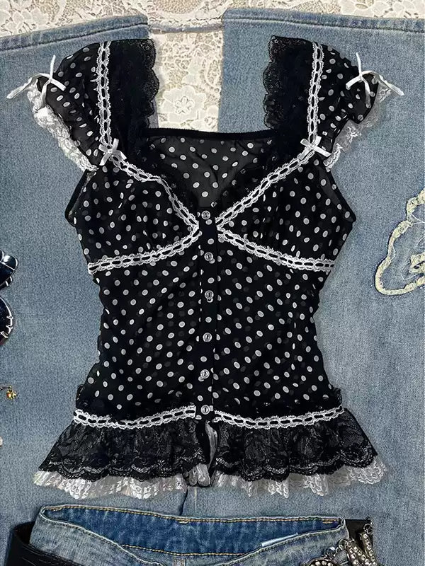 Dark Coquette Lace Polka Dot Chiffon Shirt