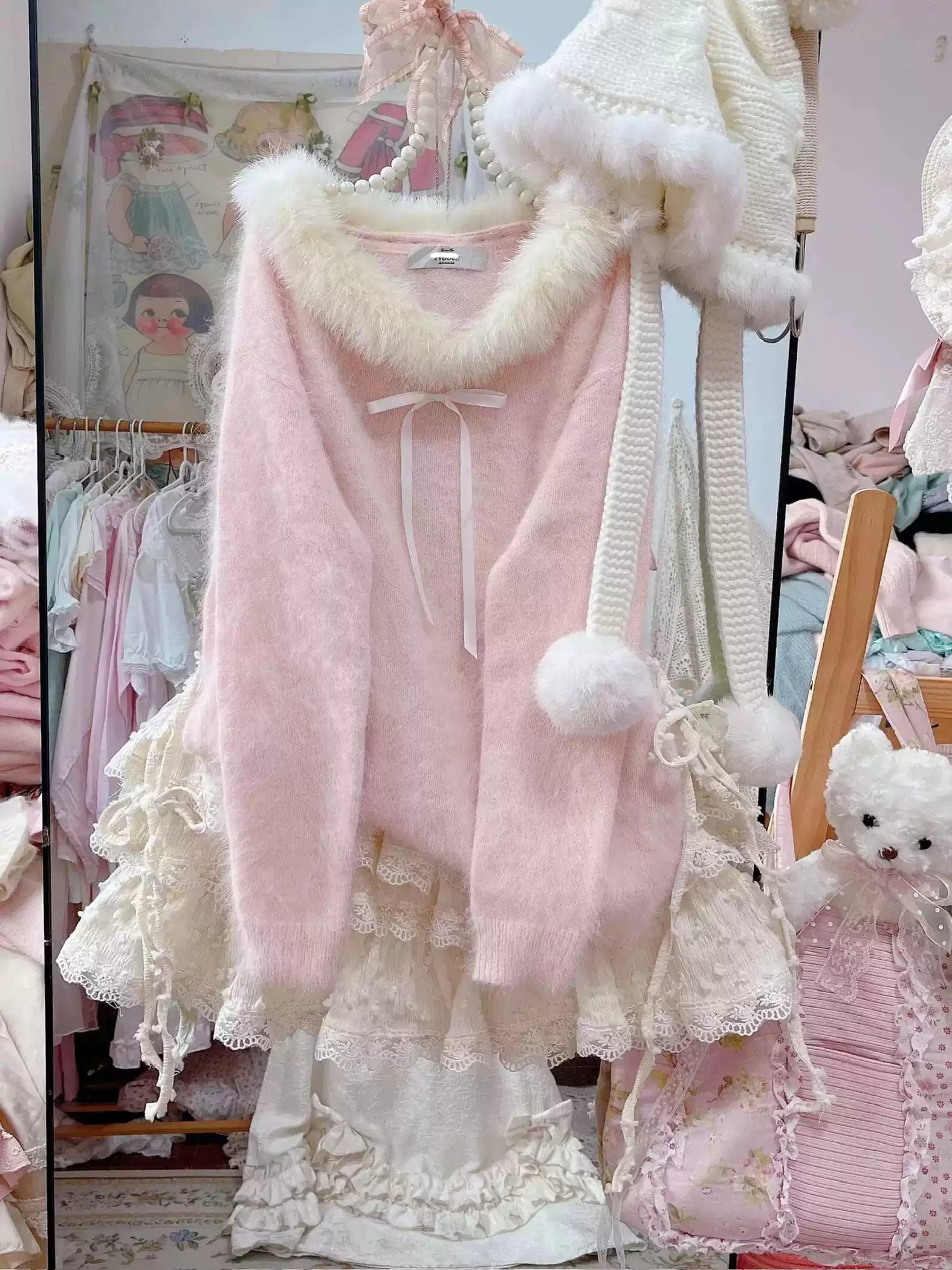 Korean style furry collar pink long-sleeved sweater
