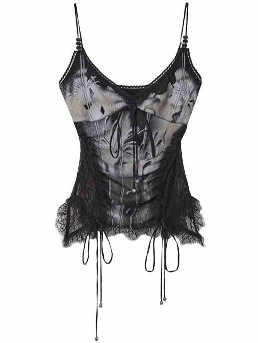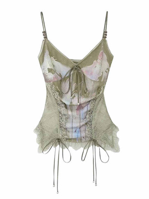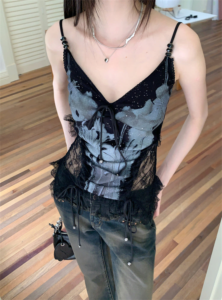 Lace Splicing Printed Tank Top