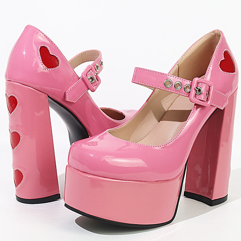 Fall in love with our Lovecore Hearts Mary Janes! These high heels feature a playful pink heart pattern, adding a touch of whimsy to any outfit. Elevate your style and comfort with these heels, perfect for a night out or a day at the office. Love your look. Love your step.