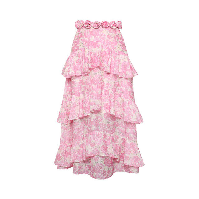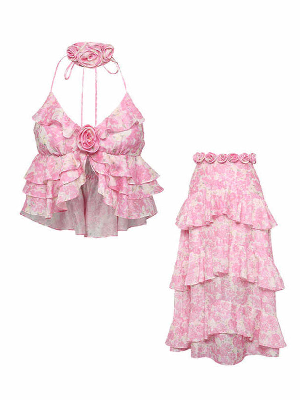 Pink Rose Floral Ruffle Halter Top & Skirt