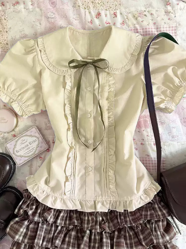 Embrace vintage charm with this Retro Korean pink doll collar short-sleeved shirt. Its delicate doll collar adds a sweet, feminine touch, while the soft pink hue brightens your look effortlessly. Perfect for warm days, the short sleeves keep you comfortable without sacrificing style. This shirt pairs beautifully with high-waisted skirts or jeans, making it a versatile addition to your wardrobe that effortlessly blends retro appeal with modern comfort.