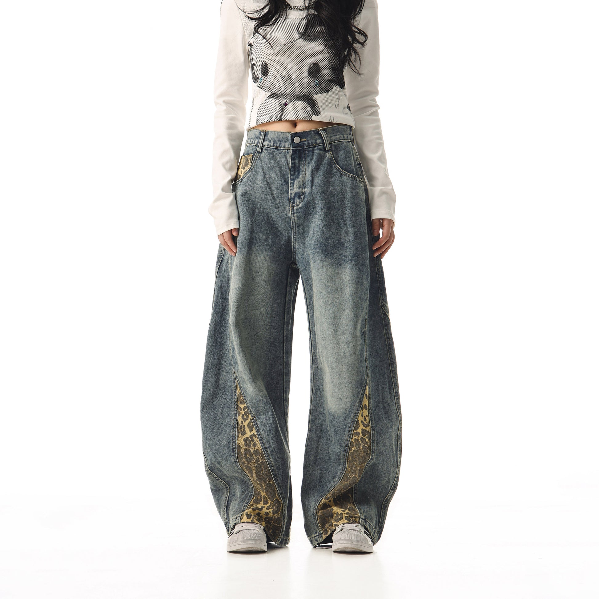 Step into bold style with these retro leopard print scimitar jeans. The iconic animal print brings vintage flair to your everyday wardrobe, while the flattering scimitar cut hugs your curves in all the right places. Perfect for making a statement, these jeans blend nostalgic charm with modern comfort. Whether you're channeling '90s energy or creating an edgy contemporary look, this versatile piece pairs effortlessly with everything from crop tops to oversized blazers. Elevate your denim game and embrace your wild side.