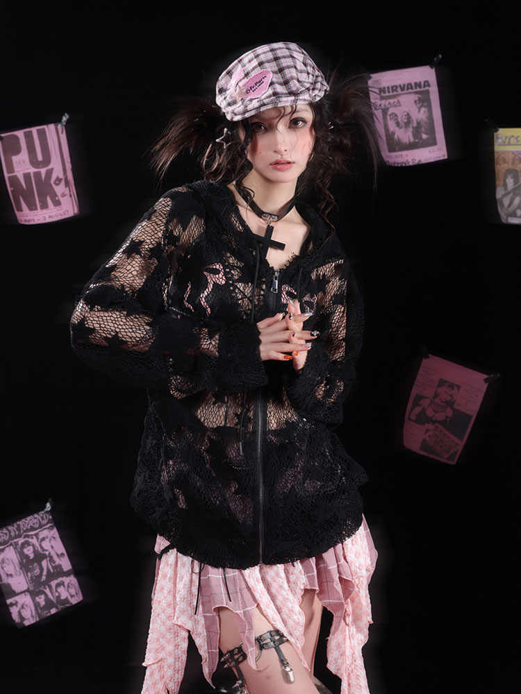 Stars Hooded Mesh Hollow Zip-up Hoodie