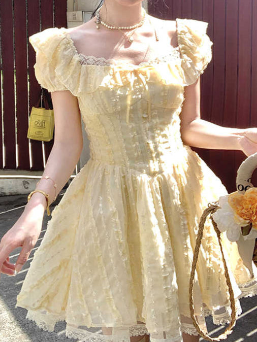 Yellow Square Neck Puff Sleeve Dress